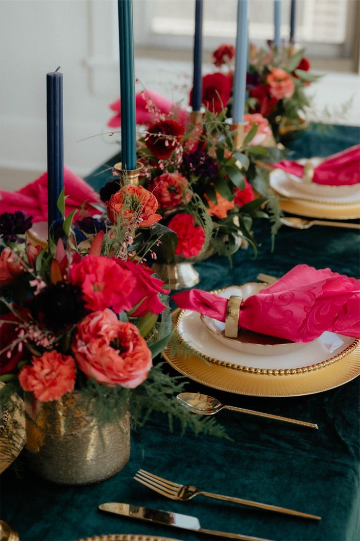 Tall candles in brass holders and dramatic floral arrangements (think dahlias, peonies, or orchids in deep hues) complete the scene.